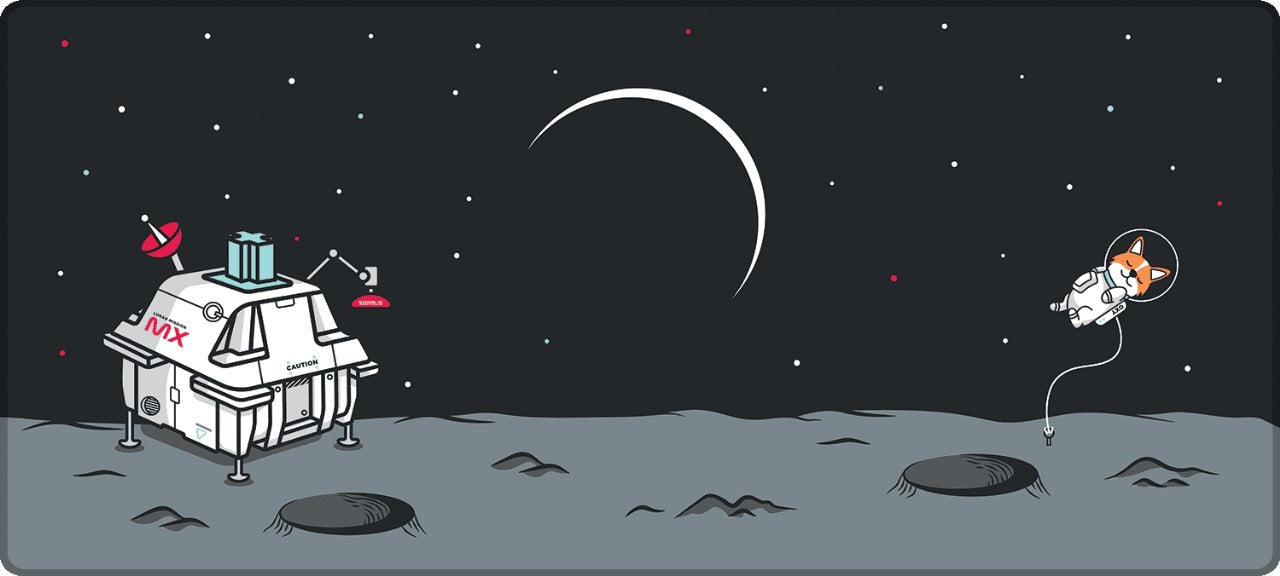 Set on a distant moon with an astronaut floating past a futuristic base, this design fuses cosmic calm with clean, modern style. Built for precision and comfort, its smooth glide surface enhances every move, while the non-slip rubber base keeps your control locked in.